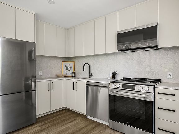 The beautifully designed studios at Greenpoint Central boast oversized windows, a sleek kitchen with custom white grain-matte cabinets, quartz polished countertops and backsplash with stainless steel appliances. Elegant bathrooms offer a natural vanity with matte black hardware, a Yukon Blanco stone vanity top, and stylish matte black sconce lighting. All your modern day conveniences are included such as a washer and dryer, and vented mini-splits and impressive ceiling heights.