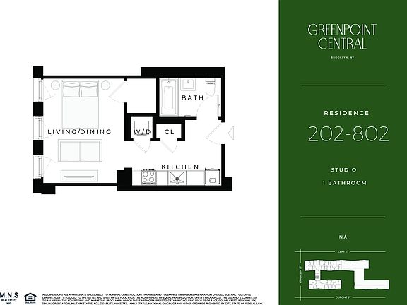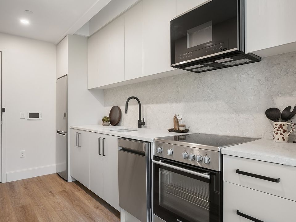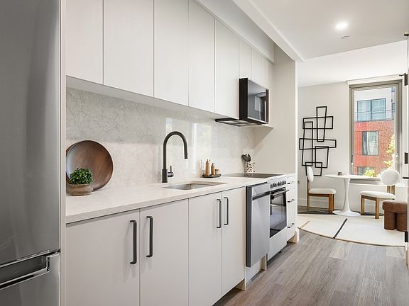 The beautifully designed studios at Greenpoint Central boast oversized windows, a sleek kitchen with custom white grain-matte cabinets, quartz polished countertops and backsplash with stainless steel appliances. Elegant bathrooms offer a natural vanity with matte black hardware, a Yukon Blanco stone vanity top, and stylish matte black sconce lighting. All your modern day conveniences are included such as a washer and dryer, and vented mini-splits and impressive ceiling heights.