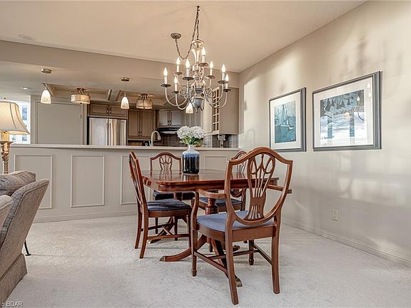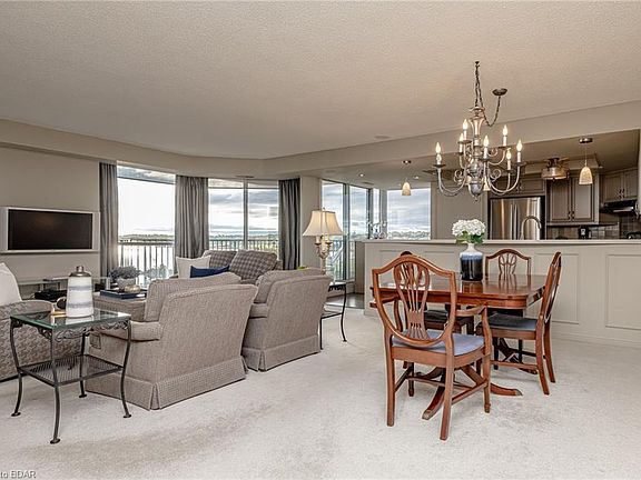 Welcome to this spacious 1,366 sq ft 2 bedroom, 2 bath front suite at Marina Bay. This home has been beautifully renovated by Total Living Concepts and provides a spectacular unobstructed view of Kempenfelt Bay from all principal rooms. There are 2 walk outs to the balcony from the living room & breakfast area. Bright and sunny with floor to ceiling windows and warm neutral colours. Stunning upgraded open concept kitchen provides custom Champaign coloured cabinetry, under-mount sink, quartz counters, stainless steel appliance package, pot drawers, Lazy Susan, movable island in breakfast nook, shimmering unique tile backsplash, engineered hardwood floors and a custom designed ceiling with elegant lighting features. Large living/dining room combination, makes a perfect space for entertaining. Large master suite accommodates a king bed, his & hers closets with built-in's. Gorgeous master ensuite with stone tile walk-in shower and feature wall. The second bedroom make a great guest bedroom or office, the second bath has upgraded vanity with quartz counter top, soaking tub with tile surround. Laundry room is outfitted with modern built in storage cabinets, moveable cabinet with quartz counter & ceramic floors. You are steps to the beach, waterfront walking paths, Go station, downtown festivals, shopping and fine dining restaurants. Facilities include: indoor salt water pool, hot tub, sauna, exercise room, party room a large roof top sun deck and more as well as many great social activities all year round. This suite comes with 2 parking spaces (1 covered at 65 & 1 open at 75 Ellen) and 1 storage locker. Pet friendly building, the convenience of 2 elevators, onsite management office, on site superintendent and cleaning staff, private garbage removal, security staff, and loads of visitor parking. You don't want to miss out on this lovely suite.