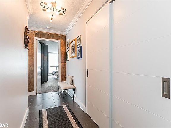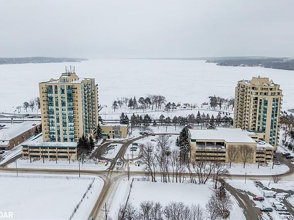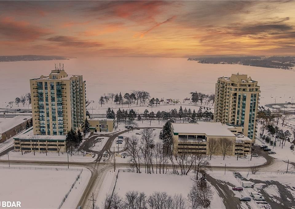 Waterfront living at it's finest! This stunning 2 bed 2 bath condo has been updated top to bottom, featuring highlights of quartz countertops with glass backsplash, stainless steel appliances with hidden matching panel dishwasher, crown moulding, expansive windows for tons of natural light, recessed pot-lights throughout and one of a kind custom enlarged master ensuite. Experience the best of downtown Barrie with a variety of fine restaurants, walking distance to GO-Train and, peaceful harbour walking trails as well as nearby hiking and parks. The amazing layout utilizes all 1000+ sqft of comfortable living space, offering you the best of Barrie and waterfront residency. Featured amenities of Marina Bay include indoor pool, sauna, exercise room, hot tub, party room, controlled access security, and more. Video tour below for more on this amazing waterfront home! Enjoy your morning coffee within the gorgeous sunroom offering views of the lake, a beautiful modern kitchen complimented by under cabinet lighting. Contemporary tile flooring throughout the main living space provides stylish durability and easy upkeep. The luxurious master suite is finished with a beautiful accent wall, ambient lighting, and spacious wardrobe, highlighted by the knockout master ensuite with full glass shower. Take your entertaining outdoors with the enlarged terrace, plenty of space for seating or enjoying the summer weather. This unit also provides additional storage space with the included locker, as well as 1 garage parking.