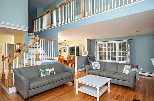 This stunning Colonial is located on a retreat lot in popular Clark Estates. You will immediately notice an open staircase in the main living area that leads to the second level. Large windows bring much natural light into the living room, which has a wood burning fireplace, custom built ins, and gleaming hardwood floors that run throughout the main level. A large eat in kitchen with white cabinetry, a peninsula, and built in desk provide plenty of workspace for the cook of the house or a great space to entertain. The main level also has a formal dining room (currently used as an office), a laundry room, and a half bath. Upstairs you will find the master suite with hardwood floors, large closet, and an en suite bath with a clawfoot tub, shower, and pedestal sinks. Three additional bedrooms, a bath, and a versatile bonus room complete this level. There is a partially finished basement, great outdoor living spaces, and more. Close to shopping, golf, and dining at The Pinehills!