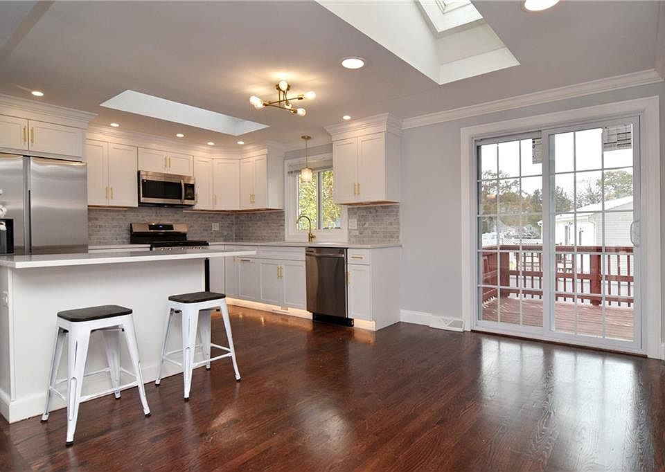 Stunning Contemporary Showplace best describes this extensively renovated 3-4 bed, 2 bath Split Level Raised Ranch set on a private corner lot with a family friendly fenced back yard. Tens of thousands of dollars spent and months of work by professional contractors has created your dream home come true. The Living Room/Kitchen wall was removed to open up the main level floorplan. The 14 x 12 main level Living Room, w/backlit electric Fireplace. and the hallway are capped with fully illuminated crown molding. The gorgeous new fully applianced stainless steel and quartz Kitchen, open to the Living Room, offers a Center Island w/Breakfast Bar and dual skylights. The full finished walkout basement offers In-Law potential with a new 19 x 13 Living/Family Room. new full bath, a 20 x 9 Den and a 14 x 12 additional unfinished room. Major improvements include, but are not limited to, New roof, exterior and interior paint, new replacement windows, new interior and exterior doors, dark stained and refinished gleaming hardwood floors, new gas heat and hot water, new central air will provide the most discriminating of buyers with peace of mind and years of worry-free home ownership. SEE VIRTUAL TOUR OFFERING 62 PHOTOS AND FLOOR PLANS WITH LAYOUT AND ROOM DIMENSIONS