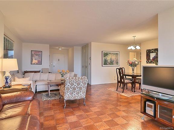 Best of both worlds! Relax after a day's work on your balcony with panoramic views of Stamford and Long Island Sound in the distance. Open, airy and bright, this corner unit boasts two huge bedrooms and two full baths. Updated galley style kitchen with granite counter tops and ample cabinet space. Oversized living room/dining room, perfect for dinner parties & entertaining! Newly refinished hardwood floors throughout. Located in a serene, quiet neighborhood, yet still walking distance to all that downtown Stamford has to offer. Take a leisurely stroll to the restaurant district, shopping mall, Performing Arts Center and Metro North Station for easy access to NYC. If you love the outdoors, the nearby Cove Park and Beach is must visit. One assigned parking space is included. Unit also comes with a small storage bin. Washer and dryer conveniently located on each floor.
