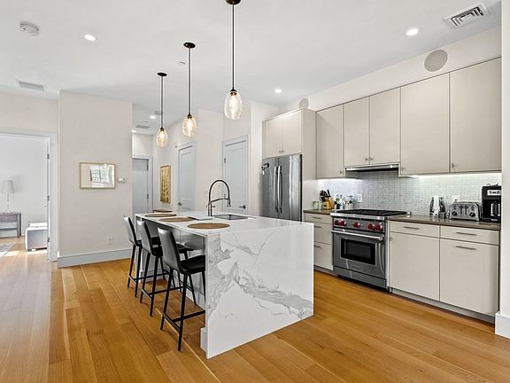 Constructed in 2018 by one of JP's premier builder, this lovely second-floor residence is thoughtfully laid out to maximize space and functionality. Enjoy a bright open concept kitchen and living area w/ recessed lighting, hydro-air HVAC + surround sound. The chef's kitchen boasts professional grade appliances including a luxury Wolf stove, Jenn Air refrigerator, dishwasher + microwave drawer, custom-built cabinetry as well as a fantastic Island with high end Quartz tops w/ waterfall finish. Just down the hall, you will find two spacious bedrooms, a luxury bath w/ spa like features, and convenient laundry. High ceilings w/ tons of sunlight, quarter-sawn oak floors - perfectly located to enjoy all of Jamaica Plain w/ quick access to Boston and surrounding areas. Just blocks away from the Green Street T + restaurants/cafes, shopping and bars of Centre Street - 65 Green offers everything you desire! Garage parking, professional mgmt + storage locker round out this fantastic space.