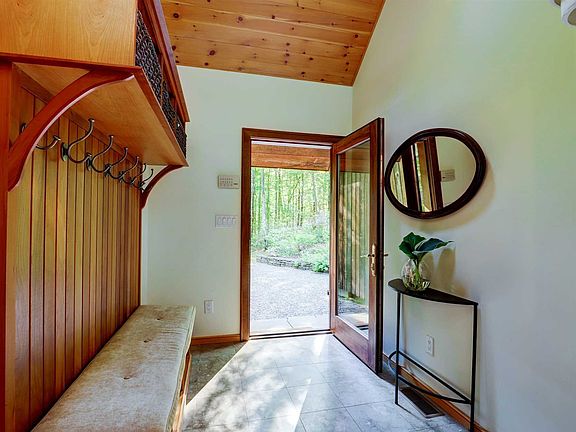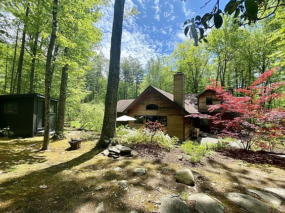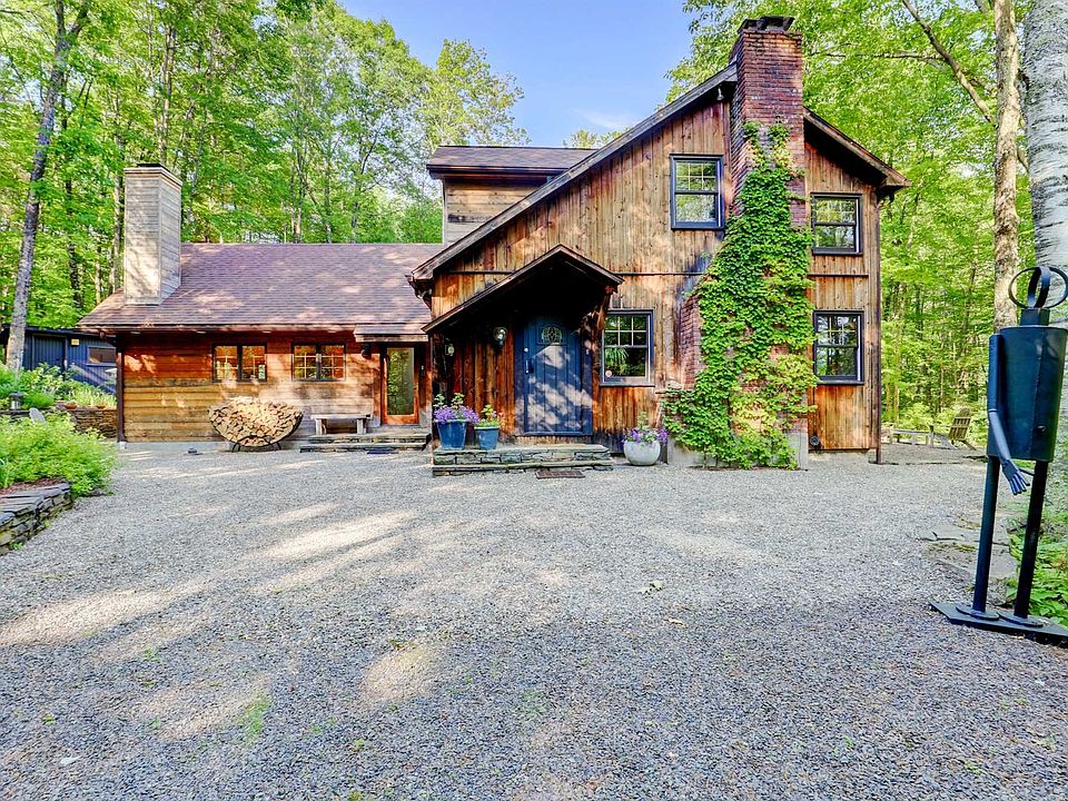 Three bedroom, 3 bath, almost 3,000 sq.ft., custom crafted cedar-sided post and beam in a tranquil sun-dappled English garden setting, on 6 fenced and private wooded acres 10 minutes from Woodstock Village Green. New additions blend seamlessly with a restrained Scandinavian palette of white walls, wood beams and natural stone surfaces. Hickory and oak floors throughout, Crown Point maple wood cabinetry in kitchen and bathrooms, Pella Architect range windows and Douglas Fir doors. The entry mudroom has radiant heated limestone tiled floor and custom cherry wood Hall tree. An open flowing floor plan connects the kitchen to dining and living rooms The over 500 sq ft kitchen addition with soaring Hemlock-beamed cathedral ceilings is well equipped for entertaining with river washed granite counters and island, 3 stainless sinks, 2 dishwashers, 6-burner Wolf range with grill, Liebherr fridge, Grohe fixtures, Miele wall ovens, Restoration Hardware and Nelson pendant lighting, walk-in pantry, Jotul enamel wood stove and French doors out to blue stone patio. Wet bar niche with soapstone counter includes display cabinets and wine fridge. The post and beamed living room features a floor to ceiling bluestone wood burning fireplace and 2 sets of French doors. The airy and spacious ground floor master bedroom suite with cathedral ceilings and walls of windows, leads out to the garden through French doors. An extra room off the master is currently used as an office and not shown in the photographs. Master bathroom includes steam shower, Jerusalem limestone vanity and cherry wood shelving. Upstairs are 2 bedrooms and a new full bath. A third bathroom features Turkish limestone tiles and vanity, an Aquatic chromatherapy air jet deep soaking tub, European flat panel Runtel towel warmer, and Restoration Hardware and Toto fixtures. The property includes extensive landscaping with specimen trees, flowering bushes and perennial flower beds, bluestone walls, raised bed vegetable garden, mini-barn with heat and electric, wood shed and whole house generator. Brand new septic and leach field has been recently added. The private for Grog Kill residents only community swimming pond is just a few minutes walk away. With its idyllic secluded setting and sense of absolute privacy, this exceptional property provides an oasis of calm just 2 hours north of New York City.
