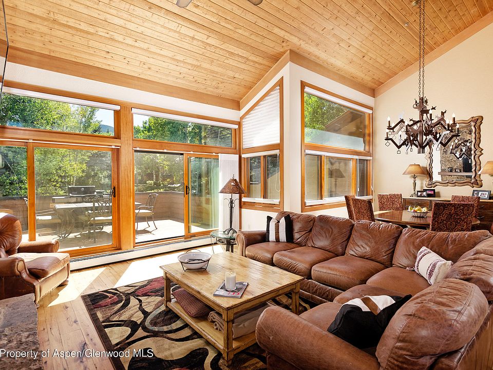 Light and bright, remodeled 3-bedroom/3 bath townhome in a premium location on Harleston Green in SMV. Upper level living with vaulted cathedral ceilings, spectacular open floor plan including living room with a wood-burning fireplace, dining room and updated kitchen. Large deck with new motorized awning opens to the panorama of mountains and ski area. Perfect for entertaining! Upper level includes an office area and one bedroom with a Queen and full bed plus a bonus loft (100 sq ft). The first level features a mudroom, large main floor ensuite master bedroom with custom walk-in closet and an additional one bedroom with full bath. Large deck off the master has a private hot tub. Back yard opens up to Brush Creek. One car garage with ample storage throughout the home. Truly one of a kind. 2021-09-28
