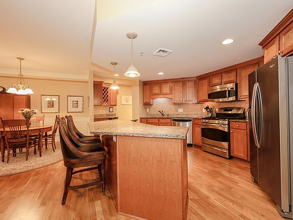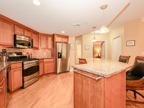 Premier location on the first floor in the rear of the building overlooking the quiet natural setting. This well-maintained 2 bedroom, 2 bath, home welcomes you to live and thrive with carefree living at the desirable over 55 community of Riverwalk at Bedford. Condo features include gourmet kitchen, stainless steel appliances, granite countertops, large kitchen island for gathering of friends and family. Open concept living with kitchen, dining and living room. Enjoy the warmth of a cozy fireplace or the fresh air on your private serene balcony. Master bedroom suite includes a sitting area, generous sized closets, tiled flooring, jetted tub and stand-up shower. The second bedroom makes for a perfect guest suite, office or den with easy access to the 3/4 guest bath. There is a heated garage under the building with a secure storage unit and 1 deeded parking space accessible by elevator. Within this lovely building is a theatre, exercise room, game room with bar and pool table, library/computer center, gorgeous gathering room with a beautiful fireplace for larger gatherings. Everything you could want or need without leaving the community. Call for a private showing today,
