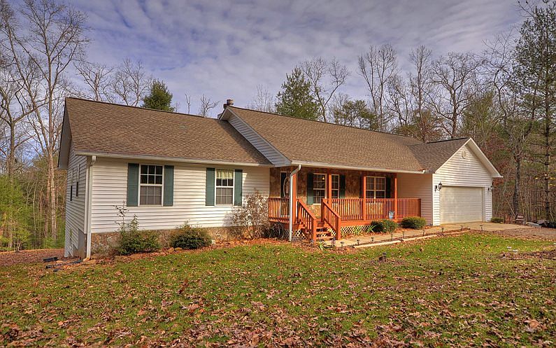 One-level living in this well-maintained, spacious, and comfortable ranch at end-of-road for privacy with plenty of parking. Open floor plan that flows nicely from the moment you walk in the front door off the covered porch into a spacious great room with cathedral ceiling and wood-burning fireplace, dining area, and open kitchen with functional island. Laundry room with half bath. Master bath has loads of storage cabinets. Unfinished, full basement has entrance off kitchen and from outside - great for workshop and storage. Convenient to both Blairsville, Blue Ridge, and Lake Nottely. Perfect getaway home or permanent residence. Priced to sell!