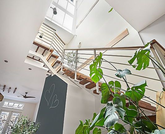 Enter apt 1, the owners 2,668 sf lower duplex (+ garden, patio and 1,250sf finished and semi finished basement) boasts three sleeping areas with room to add another bedroom on the 2nd floor, 3.5 baths and a one of a kind motorized retractable skylight. The huge skylight lets in abundant sunlight throughout the home. The whole unit is heated with radiant underfloor heating and has central AC.