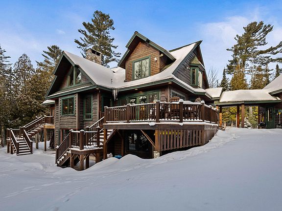 Rangeley Lake - Nestled on the serene shores of Rangeley Lake, this is an extraordinary year-round waterfront family retreat. Guests have repeatedly praised its beauty, privacy, and peacefulness. The property is well positioned for enjoyment of all 4-season sports for which the Rangeley area is highly regarded. It is also an exceptional self-contained get away for enjoyment of just this property alone. The main house is a custom-designed home spread over three levels with 5 bedrooms and 4.5 baths. A fully heated oversized double garage is connected by a covered walkway. It has complete guest quarters with private deck above. Separately, a large, detached Barn and Bunkhouse that sleeps up to 30 guests has a separate professional-grade kitchen suitable for supporting weddings, reunions, and other events. Drive-throughs for boats and snowmobiles afford added convenience for recreational vehicle storage. It's oversized area and game/play loft afford a host of activity choices regardless of weather conditions. Handicap accessibility and air conditioning in the bunkhouse assure the comfort of all guests. Step outside to an amazing 20+ acres of privacy running from Route 4 all the way to Rangeley Lake, including well over 500 feet of pristine waterfront. The property has an oversized dock and separate trampoline swimming raft, a free-standing 2-story playhouse, and a horseshoe pit. Private roads and a level grass field provide ample parking for special events. The lot has gently sloping terrain from the main house to the water's edge, which is perfectly positioned for viewing stunning sunsets from either the dock or a large firepit with seating. Fully furnished and equipped, the property can be enjoyed from day one. For those looking for supplemental income, past rentals have more than covered all operating and maintenance expenses for this large property while still reserving plenty of time for the owners' uses. Truly, this is a once-in-a-lifetime opportunity!