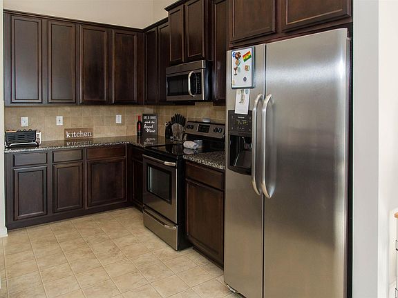 - RoomKitchenFeatures: Granite Counters, Kitchen Island, Pantry, Eat-in Kitchen, Floors-Vinyl, Cabinets-Stained