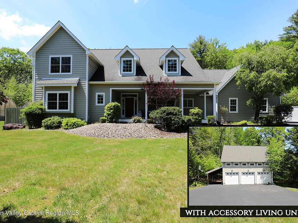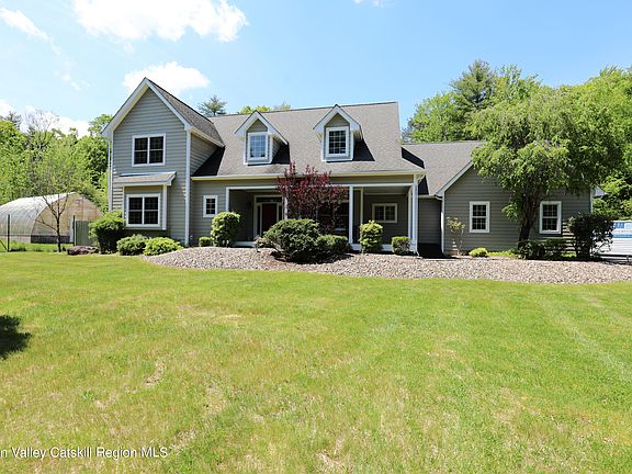 Enjoy peace & relaxation on your own private oasis! This Contemporary and rustic colonial is nestled on 6.21 gorgeous acres graced with mature trees, an inground pool, two greenhouses, and a 3-car garage. There are two main structures on the property, a large 5-bedroom home, and a detached 1-bedroom carriage house totaling +/- 6,000 finished square feet. The main residence has an open living area that marries the Living, Dining, and Kitchen into one huge living area accented by a cozy wood-burning fireplace and cathedral ceiling. The kitchen with an island has a generous breakfast bar with tile backsplash, stainless steel appliances, DCS five burner commercial stove and hood, with walls of custom wood cabinets. The first-floor features two bedrooms, a primary suite with a jacuzzi tub, double sink, walk-in tile shower, and a spacious closet. There is also another full bath and another large bedroom on this level. Adjacent to the living room is a lovely heated sunroom with French doors leading out to the back deck that overlooks the heated inground pool. The bedrooms and washer/dryer located on the first floor make for easy living and convenience. The second level boasts 3 additional bedrooms, one having extensive closet space/walk-in and a 10x16 powder room. There are two other bedrooms on this floor with a full bath, lots of storage for games, and comfortable accommodations for the family/guests. The lower level is finished offering your own personal gym & den/playroom, very open and airy with a second means of egress through a bilco door. This home is perched on a hill offering complete privacy yet not remote, you can hear the neighboring stream located at the head of the driveway. The house can accommodate lots of family, guests, and friends, it's flooded with sunlight and has plenty of open space for entertaining and interaction. There is a detached carriage house offers 850 finished square feet on the main living level, and then another 600 square feet on the ground level with another full bath, perfect for storage. A whole house generator and full water filtration system were installed ensuring modern conveniences. The rear yard provides two greenhouses that were built within the last two years for year-round cultivation, one is a rectangular structure with a foundation, all closed in and ready for use. The other is a unique round-style structure that can be used for growing, maybe as a Jacuzzi/Sauna escape/spa-type structure or art cottage. The property offers privacy, woods, rock outcropping, and all the sounds of nature, yet also has extensive deer fencing to protect the home's mature landscaping. Just under two hours from NYC, 15 minutes to Kingston, 25 minutes to Saugerties & Woodstock. Other local attractions include restaurants, local breweries, seasonal farmers' markets festivals, apple orchards, vineyards, restaurants, hiking, and so much more. Don't miss out on a great opportunity to call this place your own!