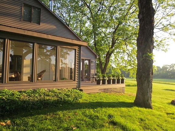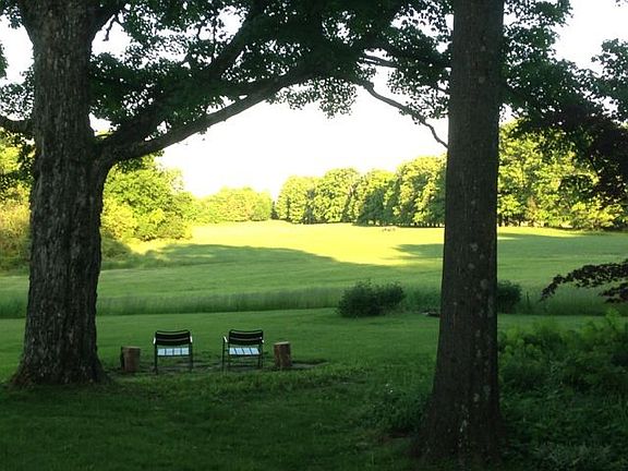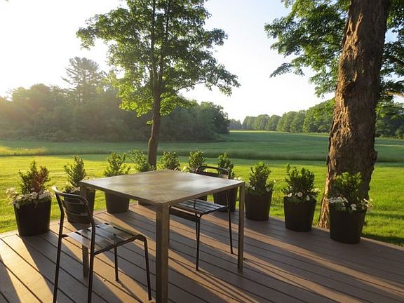This recently renovated 19th Century Carriage House was once part of the Leggett Estate and is located on Leggett Road, one of the loveliest roads in Ulster County The house is nestled overlooking 80 acres of farmland. The house has two separate apartments both with a private entrance off a common area. The spacious main floor apartment offers a loft-like open floor plan including: a very large living area with a wood burning fireplace and hand-hewn barn beams, a dining area that seats 8, as well as a solarium that has sweeping meadow views, a new modern kitchen and two master bedroom suites. One bedroom suite has a study and the other has French-doors that open directly onto a deck. Both suites have modern baths. The large second floor apartment features a large open living area with wide-board floors, and great light from both windows and skylights, and sliding glass doors open onto a private deck overlooking lovely meadows. There is also generous closet space. The kitchen features a new refrigerator, range and generous storage.