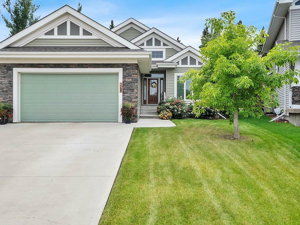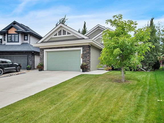 FANTASTIC location for this custom built (Canyon Springs) bungalow backing on the golf course. The huge pie shaped lot makes a perfect setting for this gracious well planned home. Enjoy the amazing curb appeal as you head to the door. Inside you will be impressed with the open floor plan, soaring ceilings and numerous windows. The great room including island kitchen with walk thru pantry, living room with fireplace and dining room with access to the covered deck and featuring custom built ins are grounded by their hardwood floors. The office/den is to your right as you enter, extra wide angled staircase to fully finished basement, powder room, laundry and spacious primary bedroom complete this level. Ensuite bath includes a walk in tub. Basement level consists of two large bedrooms, a full bath, huge family room and tons of windows, storage galore and space for crafts or games. The yard is truly a garden of delights with covered deck, gazebo and perennials galore-all bordering the golf course!