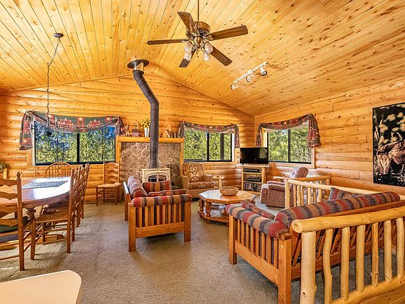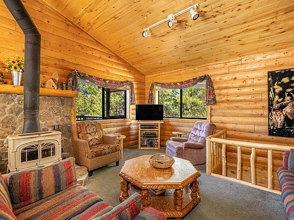 Located about 5 miles south of Angel fire, this is a stunning little log cabin in the woods. Private, quiet, peaceful, great views, and located on one acre of beautifully forested Rocky Mountain property. This cabin backs New Mexico state land with legal access for hiking or all of your favorite toys. 2 bedrooms/ 2 bathrooms on the main floor with open kitchen, living, dining and efficient wood burning wood stove. Lots of windows to take in the views. The lower level has 2 bedrooms, 1 bath and utility room and double car garage. Enjoy the wrap around deck on three sides adjacent to the living room for easy access and entertaining. This one acre parcel is at the end of the road insuring no drive by traffic making it a great place for kids and adults and pets to enjoy the quiet of the forest. Satellite, high speed internet, wifi calling, full utilities, all ready to roll. Fully furnished and accessorized. No exclusions! This would make a great investment property and has rental history.