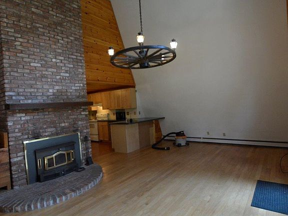 The home is a cozy, open concept A-Frame, that features a 2-level deck looking out to a good sized private backyard. The living room features a brick fireplace, cathedral ceiling, and tongue & groove pine accent walls which give it a unique, warm charm. Note that the fireplace has a wood stove insert with a blower.