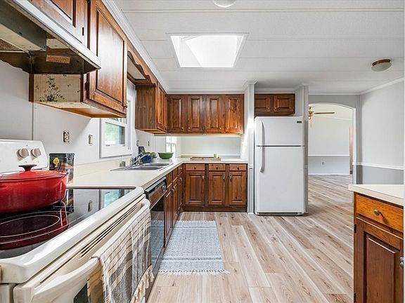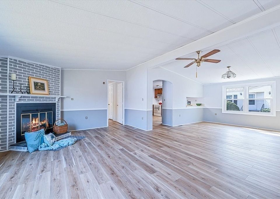 The Size and Privacy of this Lot is enviable at Pinehurst Village. Situated on the Walking path, see nothing but lush landscaped trees in your backyard with shed. Enjoy Fall evenings in the three season room, welcoming you into this spacious, three bedroom, two full bath all on one level living. Having just completed a refresh with new luxury vinyl flooring and freshly painted throughout. The open concept layout features a large, Fireplaced living room and the owner's bedroom with ensuite bath. Ample storage and washer/dryer hook-up. Easy walk to Clubhouse with seasonal, inground pool. $600 monthly park fee includes water, sewer, excise taxes and clubhouse facilitlies.