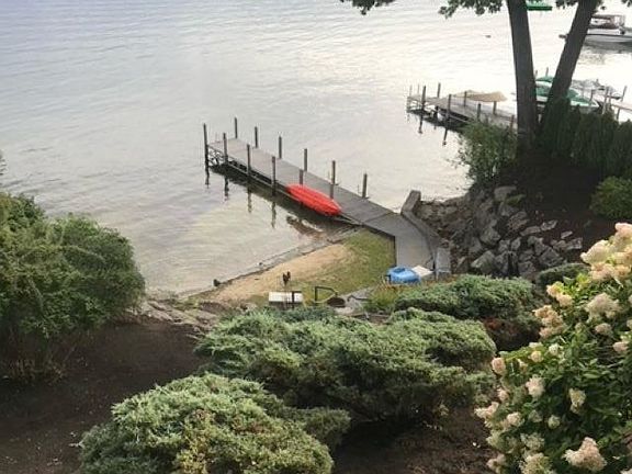 Winnipesaukee lakeside living on Meredith Bay! 90' of owned waterfront, a 40' deep water dock plus mooring. Room for the big boat, jet skis, paddle boards & kayaks. The crystal-clear water of Lake Winnipesaukee & this sandy bottom is priceless. Elevated above the lake, this exquisite home is a contemporary design that you would expect to find on Lake Tahoe. The main level is an open concept floor plan with almost 2,000 sq. ft. and lives bigger than that. The walkout basement is 1,900+ sq. ft. & ready to be finished. Already stubbed for bath & bedrooms. A wall of glass provides incredible views of the lake; vaulted ceilings, skylights and motorized transom windows further enhance the natural light and air flow throughout the home. Windows on the entire lakeside offer panoramic, expansive views of Meredith Bay all the way to Gunstock ski area & the iconic Belknap Mtn. Range. At night, the view becomes the moon and stars. The southwest exposure gives the swimming areas, dock and deck full sun all day. It's a short ½ mi. walk to in-town Meredith. Town water/sewer Showings start at Open house by appt. only with proof of funds Sunday 3/13 1pm - 4pm