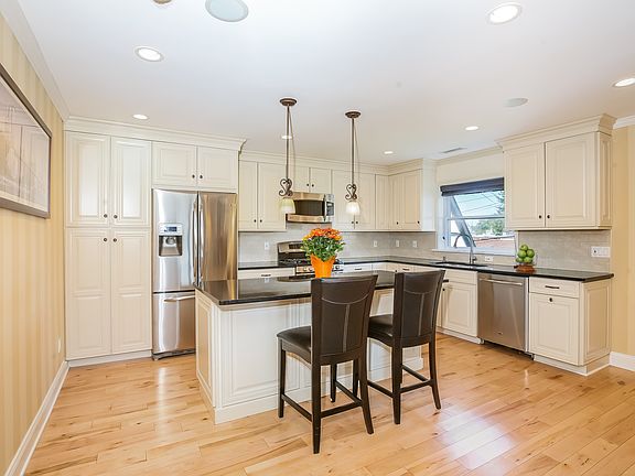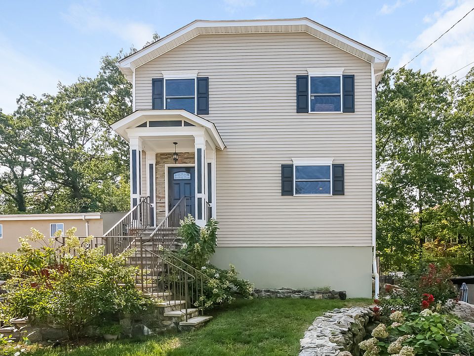 Beautifully renovated Colonial with open floor plan and modern amenities for today's lifestyle! Set back from the road and sitting up high amongst the tree tops, this builder's home was thoughtfully renovated and updated in 2001. It features an open floor plan showcasing a gorgeous chef's kitchen with granite counter tops, stainless steel appliances and large island. The first floor also features wide-plank floors, exposed brick, a large bedroom, full bath with spa tub and a laundry room. The second floor includes a generous master bedroom with tray ceiling and French doors to a large balcony spanning the entire length of the house. Two additional bedrooms and a hall bath round out the second floor. The lower level has a sun-filled, walk-out family room and a full bathroom with marble counter tops. Amenities include a high-efficiency boiler, Sonos speakers and sound system, alarm and sprinkler system, new windows, roof, siding, etc. Walk to shopping area and close to downtown Larchmont train.