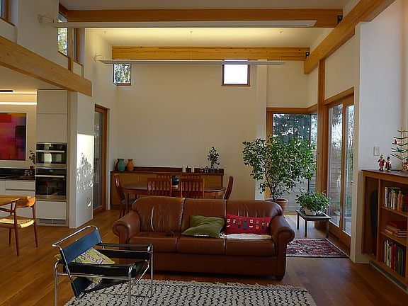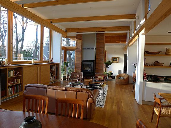 A near zero energy modern design, sustainably built to minimize maintenance, water and energy usage and environmental impact, this house is spacious and suffused with light. Its high performance exterior, triple glazed windows and orientation to the sun create warm, inviting spaces that have compelling visual connections to its landscape while maintaining privacy. This house sets a new standard for modern domestic architecture in its community. Although not for sale, it gives a prospective buyer of the land at 61 Prospect Street an example of what a modern home can be.