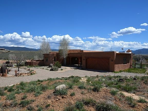 Custom home on a spectacular 5 acre parcel in a truly magical location! Lot 1 of the Valle Vista Subdivision, this particular parcel has it's own access and enjoys the protection of the subdivisions conservation areas that surround it, making your 5 acres feel like 20! Aside from a truly magnificent Taos Mountain view, you will enjoy views in all directions, and the conservation easement which protects birds and wildlife in the deep arroyo behind the house and the incredible, ancient petroglyphs on the rock face of the arroyo which have been documented and studied by several major university archaeological departments. Atop the rock face, on a flat lookout, are the remnants of a sacred ceremonial site, now a magical/mystical place to watch the NM sunsets. The house itself is made of energy efficient 16" RastraBlock, 2720 sq ft with 3 bedrooms and 2 baths, sited perfectly to wrap you in the surrounding mountain views and take advantage of passive solar gain. A dramatic front entry portal leads you to the grand, welcoming entry. The interior finishes are a stunning blend of warm woods and soothing stone. At the end of the living room is a one of a kind stone fireplace with hand selected stones. This fireplace is the heart of the home and truly a work of art. Soft limestone floors soak up the winter sun. The ceilings in this great room (and many other areas of the home) are made of split cedar raja's and vigas. The kitchen is gourmet with a 5 burner gas range, double oven, two sinks, rich wood cabinets, reclaimed wood floors, plenty of workspace and a cozy breakfast nook. The master suite is private and luxurious with access to the back yard hot tub deck, and has a walk in closet and spacious bath. There are two additional rooms, each specially sited to take in the surroundings. From the living room toward Taos mountain enjoy a walled and gated courtyard with a deep covered portal and a green grass yard...luxury for the bare feet! There is a fully fenced back yard with gates to the conservation area in back which is ready for your exploration. Additional features: Detached, heated 2 car garage with a half bath, gated driveway, thoughtful landscaping with drip irrigation, custom wood interior and exterior doors and screen doors. This house and all of it's components, have been lovingly maintained and is truly a one of a kind for the most authentic Northern NM experience. History, beauty and luxury all wrapped up in your new home!