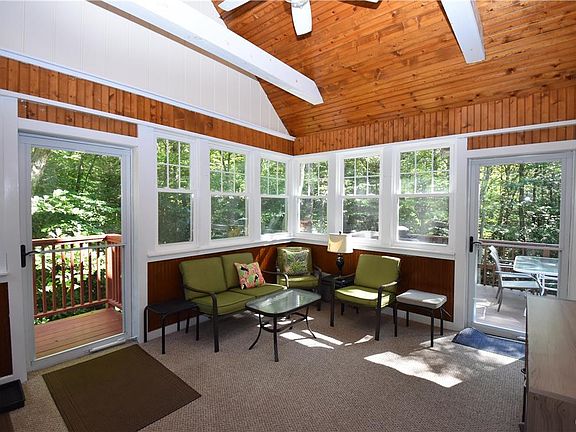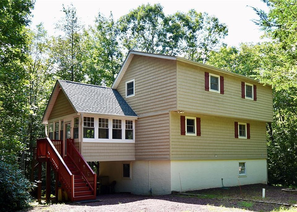 Calling all NATURE LOVERS...Enjoy the tranquility of the babbling STREAM on this unique and secluded 1.29 acre lot! Home is tucked away on a cul-de-sac in the Mountain View section of Bear Creek Lakes. SPACIOUS 3 bedroom 3 bath open concept saltbox home awaits you! Plenty of living space on 1st floor which consist of 3 season room with vaulted ceilings, Living room w/ cathedral ceilings, hardwood floors, propane fireplace, Kitchen is equip w/ SS appls, pantry, breakfast bar. Main level also offers private rear deck that overlooks wooded lot that leads to stream. Second floor consist of 2 spacious bedrooms and full bath. The lower level is a bonus to this wonderful home providing additional finished living space featuring full bath, laundry rm, storage area, large gathering rm w/glass sliding door which provide access to rear yard. Enjoy all the amenities that Bear Creek Lakes has to offer! Minutes to historical downtown Jim Thorpe, concert venues & outdoor activities! CALL today!