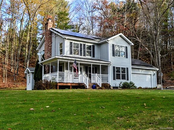 Step up to this 13 yr young home and onto the inviting wrap around porch. With a large lot, the options are endless with space for gardens, chicken coop, playscapes and so much more Inside, this home has it all with an open floor plan, timeless wide plank hardwood floors, a wood burning insert, propane for cooking, finished walk-out basement, central air, solar panels and an attached 2-car garage. The shed outside and the chicken coop bring character to the setting of the backyard with a sizable deck for your pleasure and a newer paved driveway for great convenience year-round. Solar panels and insulation make this home most efficient. This home is very economical to live in - with electric bills running only $20-$65 a month, between 180-200 gallons of oil a year and 3-4 cords of wood a year. Close to the wonderful features that the area has to offer including town shops, Ski Sundown, hiking trails, wineries, fishing, canoeing, tubing, private lakes, the Farmington River and many other characteristics of New England