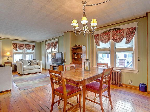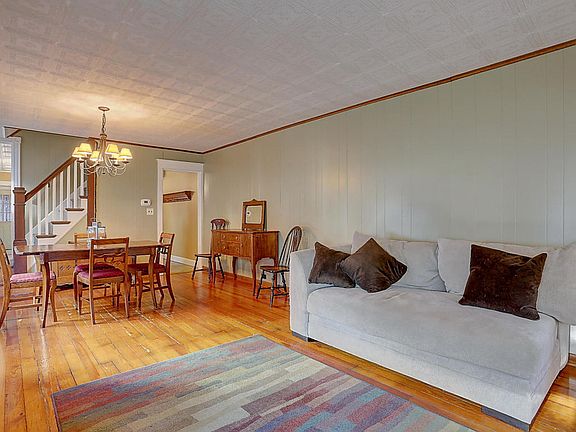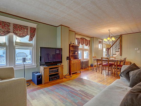 This fabulous semi-detached home with a welcoming front porch has updates from top to bottom! It features: large kitchen with beautiful island, Corian counter tops and tile back splash,huge 1st fl laundry/mud room with separate half bath, 3 Season room overlooking backyard and easy access to the detached garage, balcony off possible 4th BR, renovated bathroom, finished 3rd floor,ll family room,new economical steam heat and a new roof. Super home