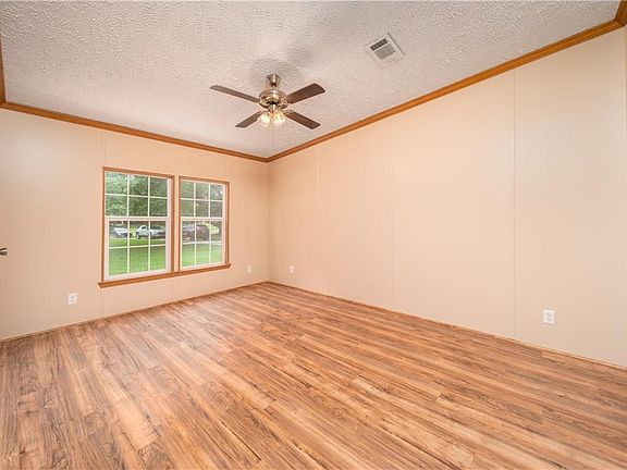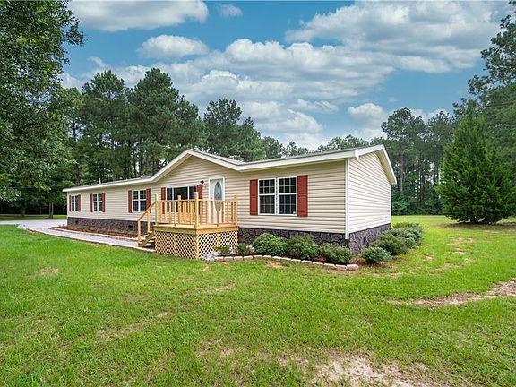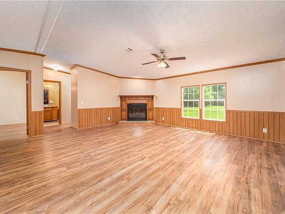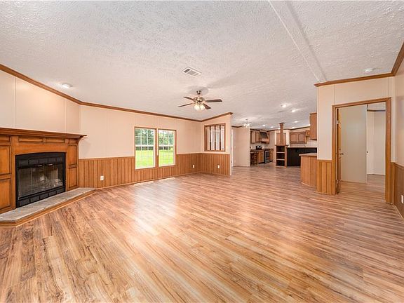 Situated on 2 well kept acres, this 2008 Kabco manufactured home is completely move-in ready! Split floor plan, with 4 bedrooms and 3 full baths. The large open kitchen has been updated with new stove and sink and overlooks the living room, dining room with new French doors leading to back porch, AND den with fireplace. Fresh paint and new flooring throughout- no carpet! All 3 porches are newly constructed, fresh limestone driveway and landscaping. New roof, water heater and new a/c!