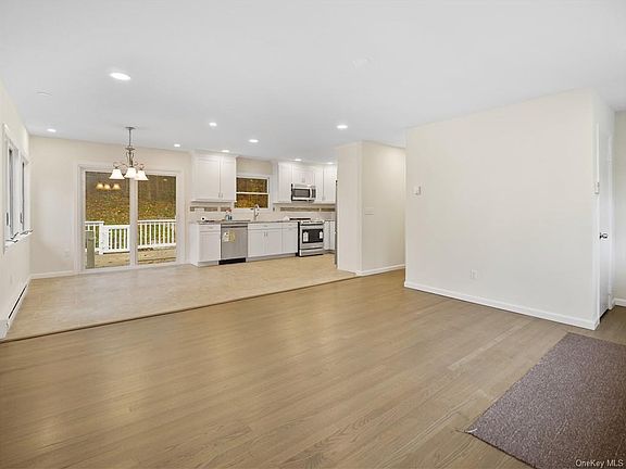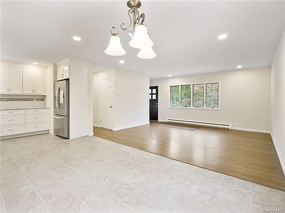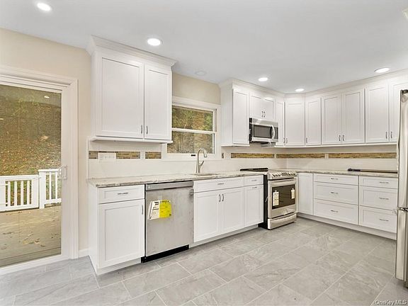 We are featuring a completely remodeled ranch style home in Mahopac, NY. This home features a large living room with open concept to kitchen, three bedrooms, three bathrooms, a family room, den, and laundry room. The Kitchen has granite countertops, the backsplash is a white subway tile with a brown small tile design, large tile floor, and stainless appliances. All three bathrooms have showers with tile that have their own unique design. The master bedroom is very large with a master bathroom. The upstairs has wood floors going throughout. The downstairs family room has a fireplace with a large window to bring in the sunlight. Once you park your car in the garage, you can enter the basement and the third bathroom is right there.