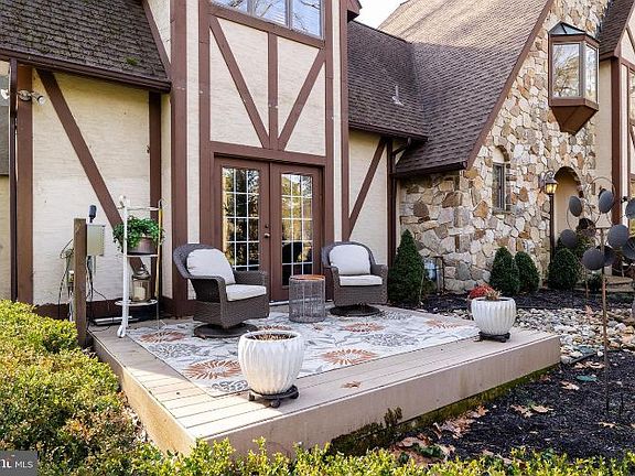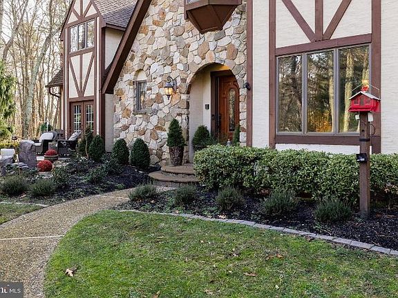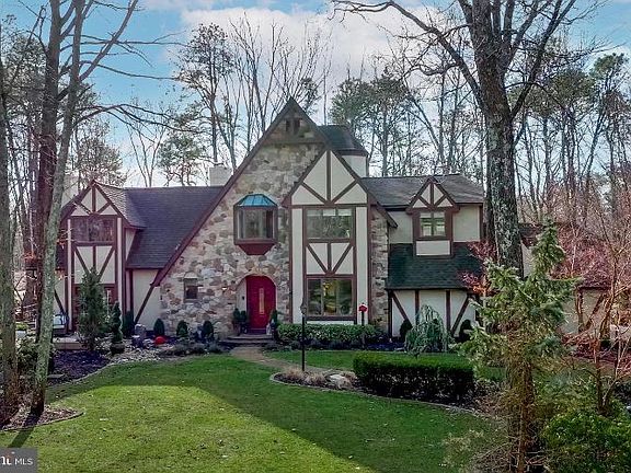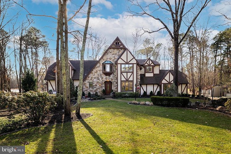 An artfully-designed, builder's own custom Tudor with modern flair and Little Mill Golf Course views is set on a premier cul-de-sac in Evesham Township, close to Black Run Preserve's walking and biking trails. The private, resort-like setting on 1.1 open, tree-lined and professionally landscaped acres features a huge paver patio, outdoor kitchen, firepit with seating area, up-lighting, fish pond and rear waterfall. Within its light-filled layout is a stylish in-law suite ideal for multi-generational, guest or au pair; it contains a private entry, bedroom, full bath, gourmet kitchen and living room. This stone-accented Tudor is edged by park like landscapes, while the flowing floor plan offers generously-scaled rooms filled with chic details. Highlights include flooring of maple, cherry and antique hardwood, three brick fireplaces, multiple skylights, oversized windows framing lush woodland and fairway views, a wet bar and specialty lighting. A combination of traditional and contemporary design elements lend a fresh, bright feeling to each updated space. The professional restaurateur's kitchen has Travertine floors, custom self-close cabinetry, extra large center island, granite counters and upscale stainless steel appliances from Thermador and Miele. A focal point in the dining area is the double-sided fireplace fabricated from antique bricks which is shared with a fabulous great room tucked under a white planked ceiling accented in dark wood beams. Another brick fireplace graces the living room featuring French doors to the front property. A view-filled dining room features antique hardwood floors with custom inlays. Floor-to-ceiling windows take in golf course views in the family room featuring four skylights and patio door. An office sitting room is lined in custom crown moldings and wainscoting. Upstairs, a tray ceiling primary bedroom has ample storage space in two walk-in closets and built-in drawers. The spa-like primary bath contains radiant heated floors, an enormous walk-in shower, jetted tub and quartz-topped dual sink vanity. Spacious secondary bedrooms and updated baths are located on the second and third floors. The windowed, finished lower level offers ample living and storage space. Centrally located near multiple major shopping centers including The Promenade, this home is 19 miles from Philadelphia and under 10 miles to the NJ Turnpike.IN-LAW SUITE PHOTOS are after backyard photos. They start at the separate entrance door and end right before the aerial photos begin. Floor Plans, Amenities Sheet, Video and Matter Port are all available upon request.
