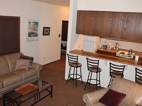 One Bedroom condominium comes fully furnished with a King Sized bed. Galley kitchen with plenty of cabinet space and a breakfast bar with space for 4. Sleeper sofa offers additional sleeping space for up to 2. Wood-burning fireplace and patio overlooking hillside. Bathroom includes closet with stackable washer/dryer. Entry area features a bench for putting on ski gear and an owners closet. Currently earning rental income through Airbnb. Smart home features to make remote management simple can be negotiated.
