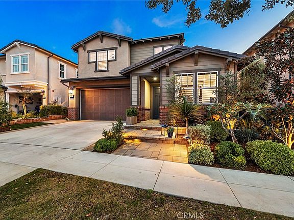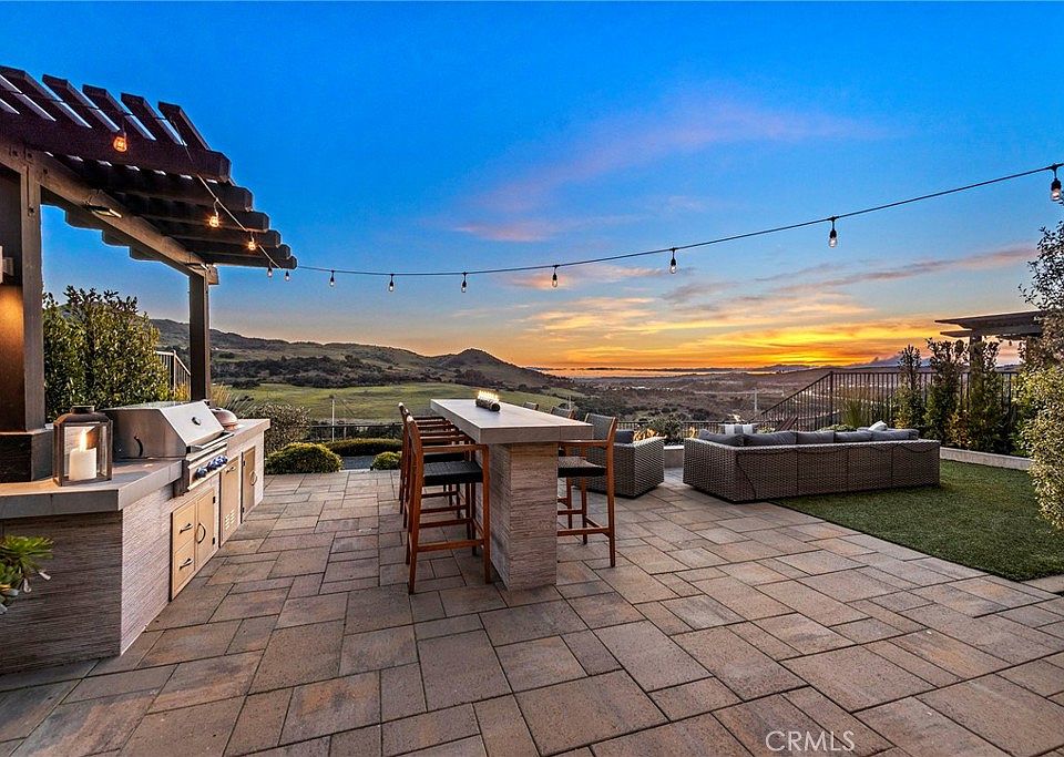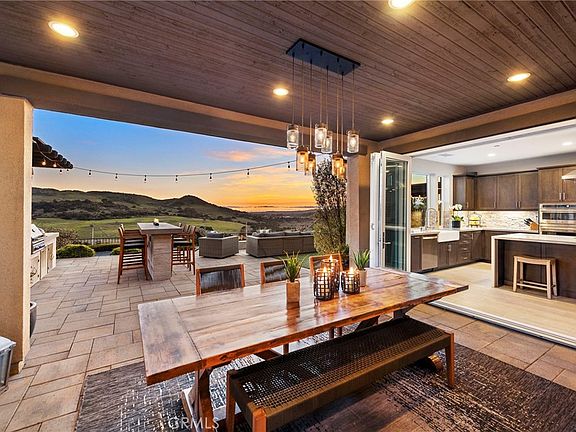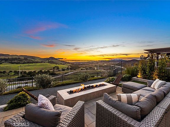 Panoramic View home set high in the hills of Rancho Mission Viejo. Modern elegance is carried throughout the property using the finest high-end finishes, natural materials, and sophisticated upgrades. Majestic landscaping surrounds the open plan interior, with an abundance of natural sunlight. As you enter the front door, you'll find the downstairs bedroom appointed with rich built-in desk topped with quartz slab countertops, custom murphy bed with built-in closet and plantation shutters and accompanied by a full bathroom appointed with upgraded quartz countertops, custom tiled shower with black framed glass door and framed mirror. The entire downstairs greets you with faux stone tile flooring flowing through the open living area with two walls of bi-folding doors leading to the outdoor room for a true indoor-outdoor lifestyle. Chef’s kitchen with marble look quartz waterfall island highlighted by the oversized chimney hood over the 6 burner chefs style range. Upgraded back quartz countertops, neutral stackstone backsplash, upgraded gray wash shaker cabinets, KitchenAid 42'' Built-in Refrigerator, 6 burner gas stove, porcelain farm sink with spring farm faucet. Spacious dining area appointed with built-in cabinetry with quartz countertops and a built-in GE wine refrigerator. The backyard is your own oasis with paver decking, linear fire pit with stacked concrete globes, built in BBQ island with tiled bar and backsplash, shade pergola with charming café string lights, 6 person built-in high top tiled bar table and un-obstructed panoramic sunset and hill views. Back inside head upstairs down the small hallway where you’ll discover the two secondary bedrooms with ceiling fans, secondary bath rooms with mosaic backsplash and dual sink vanity and a laundry room with upper cabinets and hanging pole. The Primary Bedroom is a sanctuary with beautiful hillside views, walk-in closet with custom organizers and built-in dressers with a custom barn door providing privacy for the Primary bath. The ensuite bath with double sink vanity, frameless glass shower surround, striking tiled shower with dual shower heads and a rain showerhead overhead. The property's stunning upgrades include custom window coverings, real engineered wood floors throughout the upstairs, LED recessed lighting, custom office built-ins and and fully owned Solar System. The garage with the epoxy floors and custom cabinetry completes this special home! Welcome to the best of Southern California living!