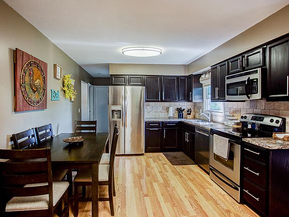 SHOWINGS BEGIN 08-06-2020 Pristine true 4 bedroom, 2 bath split with multiple upgrades and move-in ready. All stainless appliances stay plus washer and dryer. Updated kitchen, tile backsplash, cabinets galore plus buffet. Updated baths with new tile surround in main floor bath. Enjoy 3 season porch. Newly redone lower level family room and office area and new 1/2 bath. Yard is fenced and has shed for extra storage. New siding , gutters and downspouts.