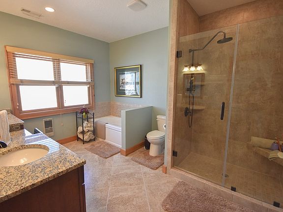 - Large Master Bedroom, Breakfast Bar, Open Floor Plan, Island, Main Level Living, Master on Main Level, Ceramic Tile Bath, Split Bedroom, Cathedral/Vaulted Ceiling