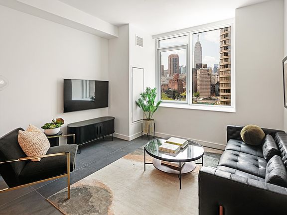 Discover luxury at 650 First Avenue, a sleek new high-rise at E 38th St and 1st Ave in Manhattan's vibrant East Side. This modern studio apartment offers up to 13' ceilings, stone and wood flooring, and large windows for luminous West facing exposure. The gourmet kitchen features stainless steel appliances, electric cooktop and wall oven, Silestone countertops, and LED-lit cabinets. Enjoy a spa-like bathroom with Kohler fixtures, an in-unit washer/dryer, central AC, keyless entry, and LED lighting.
