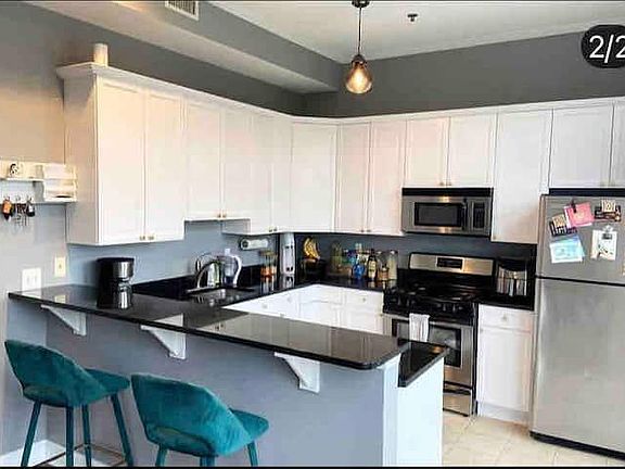 Includes Parking Spot in Garage. Smart home with Alexa in the bathroom, Samsung strip lights in kitchen, Nest smart lock and Nest thermostat. Soaring ceilings and a wall of Floor-to-Ceiling windows welcome you in to this bright Penthouse-level Lofty Urban Condo. Open concept at its best! The modern Kitchen offers dark granite countertops, Stainless Steel appliances and a XL Breakfast Bar. The Dining/Living Room space gives you so much flexibility to entertain, carve out a workspace or just spread out and relax. Beautiful Hardwood Floors throughout, Skylight, Central AC, Large Bedroom with matching double closets, In-unit Laundry, Elevator, & Deeded Garage Parking complete this perfect 1 bedroom condo. Located downtown 1 block from the Light Rail. Elevator building, deeded parking space in attached garage, freshly painted walls, and twice-a-week cleaning services. Located steps to the 2nd street light rail stop you can easily make your way to uptown Hoboken, the Path and Downtown JC with ease. FLEXIBLE MOVE IN. No broker or up front fees. Small, trained pets are allowed. Parking included. Washer/dryer in unit.