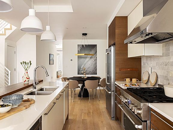 The fully decked roof is truly one-of-a-kind with plenty of space for lounging, dining, and soaking up the sun. A custom-built 10-foot arbor with removable shade systems provides a comfortable space to entertain friends and family. The outdoor kitchen features a large grill, an outdoor sink, and barbecue storage space. The entire terrace is framed with stylish, irrigated planters equipped with lighting and set on auto-timers, creating a low-maintenance, lush landscape. A dedicated storage unit located in the basement transfers with the apartment.