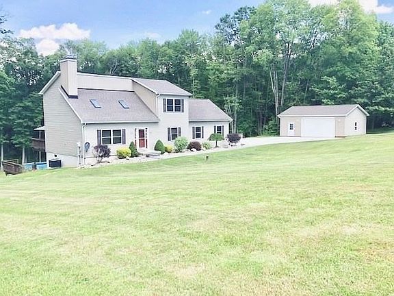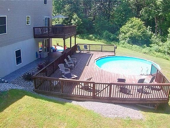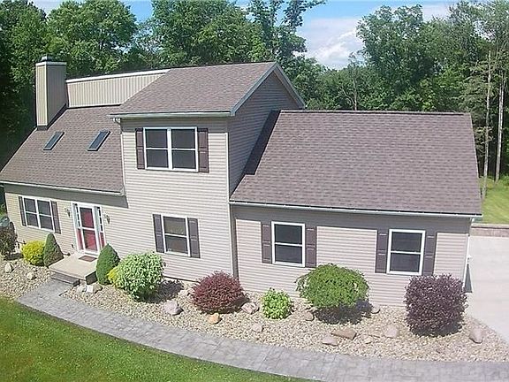 Impeccable 2 story custom built home has a private view from every window. Located on 4.5 serene acres and extends to the Shenango River. Large LR w/ vaulted ceiling, skylights and floor to ceiling wood burning FP. Dining room with Sliding glass doors lead to upper level deck. Spacious Kit with stainless appliances included, countertops galore and center island with seating. 1st floor bedroom and 2 upper level bedrooms, master suite has private bath with walk-shower and oversized tub, 9x5 walk-in closet. The second upper level bedroom has private full bathroom. The lower level game room leads to patio with enormous pool deck and 24 ft round above ground swimming pool. Finished Game room (2012) includes dry bar, private office space, full bathroom, laundry area and large reinforced 10x10 storage room. 6x10 mud room, 2 car attached and 2 car detached garage (2014). All new (2018) HVAC, and paved drive way, cement pad, stone wall, and sidewalk completes this one-of kind home.