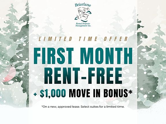 - Special offer! FIRST MONTH RENT FREE + $1000 MOVE-IN BONUS! - Receive 1 MONTH RENT-FREE + $1000 MOVE IN BONUS! This limited time offer applies to new applications with a new 13-month lease term.