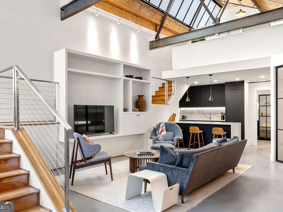 An Atlanta landmark reimagined-Residence #7 at Troy Peerless Lofts pairs dramatic sawtooth ceilings, exposed steel beams, and original exposed brick with modern bespoke designer finishes. Literally across the street from Ponce City Market and the BeltLine, this residence offers rare conveniences including two side-by-side parking spaces across from the home's front door, two secure private storage units, and generous hidden storage in the home-an unmatched amenity package for intown loft living. Spanning approximately 1,890 square feet, this home is the pinnacle of living in the historic Troy Peerless Laundry building, constructed in 1929 and now listed on the National Register of Historic Places. Architectural authenticity is preserved with soaring cypress ceilings, dramatic clerestory windows, and factory-scale steel-framed windows that flood the interiors with natural light. Original brick walls meet refinished concrete floors, while a sculptural chandelier and exposed steel beams emphasize the loft's industrial drama. The designer kitchen is a study in refined detail with Bianco Supiore quartzite waterfall countertops, custom flat-paneled cabinetry, concealed Gaggenau, Miele, and Bosch appliances and modern pendant lighting over an expansive peninsula. The Primary main-level bedroom retreat is enclosed with Rustica steel + glass dividers, balancing lofty openness with privacy. An industrial chic bath showcases seamless microcement finishes, a floating vanity topped in quartzite, Kohler fixtures, and a steel + glass shelving system. Troy Peerless Lofts offers boutique amenities including a rooftop terrace with skyline views, fitness center, clubhouse, landscaped courtyard, and pet-friendly spaces with secure gated access. Investor-friendly and turn-key, Loft #7 has a proven rental history, and the building has extremely flexible rental rules. The high-end designer furnishings are available for purchase if you so desire, offering buyers the option of a complete, ready-to-go lifestyle or income property. Integrated smart home automation provides effortless control of lighting, audio, and climate, and a new HVAC system ensures modern comfort. Anchored in the heart of Old Fourth Ward, this loft places the BeltLine, Old Fourth Ward Park, and the city's best dining, shopping, and cultural experiences just beyond your door. 650 Glen Iris Drive #7 is timeless loft architecture elevated with modern design-an extraordinary opportunity where history, luxury, and investment potential converge.