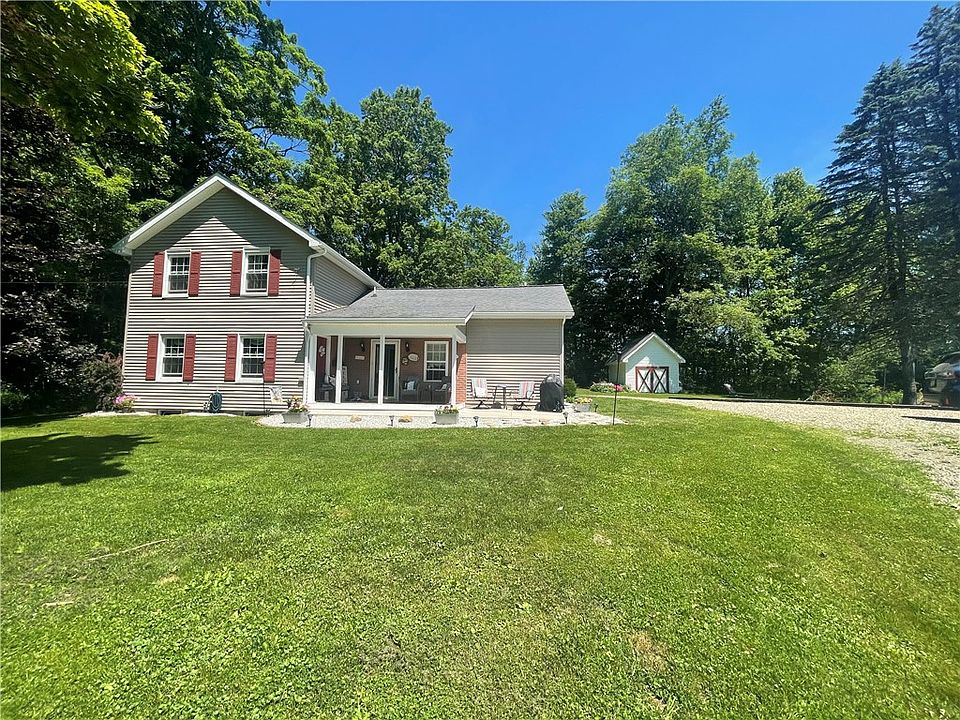 Enjoy privacy and serenity on this 2 acre property. The sprawling yard is lined with mature trees, along with some blackberry & raspberry bushes. A newly added patio provides a peaceful place to relax outdoors. This move-in-ready home features an eat-in kitchen with newer appliances, first floor laundry, new windows & gutters and two living spaces. Hallway closets and basement offer extra storage, along with oversized shed outside