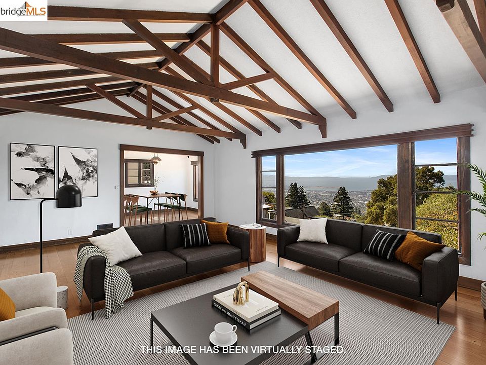 650 Hilldale has a gorgeous 3-bridge view of the east Bay and beautiful original details. In the same family for over ½ a century, there have been upgrades over the years including water heater, furnace, electrical, plumbing, drainage and a brand-new roof. This fixer has beautiful redwood trusses & beams, original random plank oak floors and a very large 8,225 SF lot. An expansive lower level could be transformed into an additional family room, bedrooms, or a separate unit. The possibilities are endless with a combination of original charm, land, views, plus a welcoming Berkeley hills neighborhood to boot. On the top floor, there are two bedrooms and a bathroom. On the entry level, there is a bathroom, kitchen, living and dining room. The bottom level has a half bathroom, a large flexible space, another smaller space that exits to the back yard and a back storage area that was once a dark room. The lower lot has a mild enough grade to imagine leveling, landscaping and creating elegant access to the outdoors. Unlimited potential!