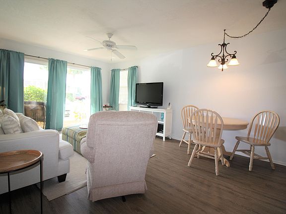 Available August 3, 2025: Fully furnished 1st floor condo, closest to the pool, pond in between, so it provides privacy. 2 bedroom & 2 full baths, split floor plan with living area in between bedrooms. Full size Washer & Dryer in the unit! Luxury Vinyl flooring in the living areas with tile in baths & kitchen. Enjoyable covered porch area off the great room slider doors. Less than 1/2 a mile to the Beach! The community has a beautiful pool & hot tub area, a work out room & club house. Near great restaurants, shops & schools! The salt air is calling YOU! Come visit for a little while or a long while at our peaceful island paradise! A great get-a-way. Please call for your showing or a video conference!