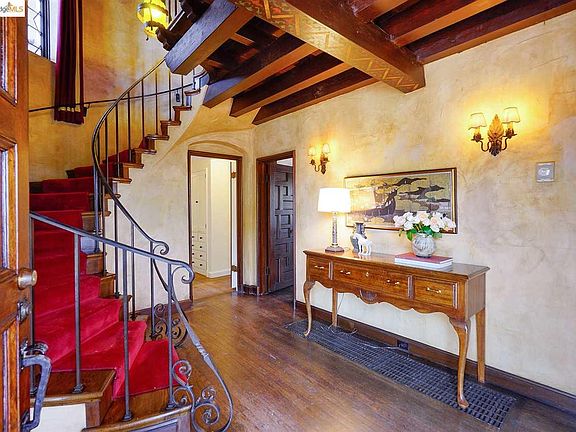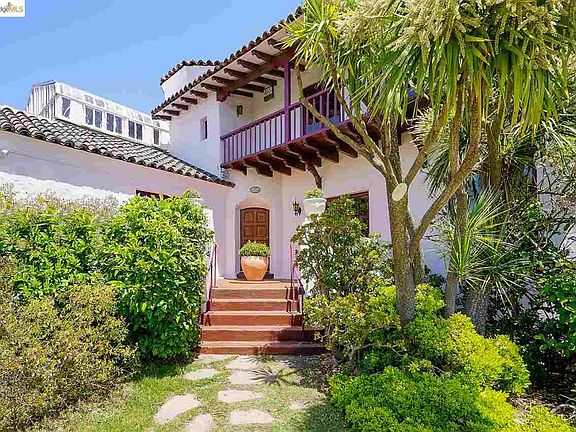 Surrounded by Roses at the Top of Haddon Hill - W.E. Schirmer's Late Mediterranean Revival Stately Mini-Mansion with wonderfully preserved period details: circular stair beamed foyer, tinted plasterwork, grand living room with music alcove, library/study suite, prohibition-style "speakeasy" in the family/game room with adjacent Vargas "pin-up" girl bathroom, turret, grand front porch, French doors, arched windows, verandah, balconies, loggia (now covered), tile roof! There are lovely bay views, storage, interior access from the garage, play house and an incredible workshop. This corner, level, ¼ acre landscape has an amazing walled back garden and yard, mature landscaping and one of the finest private rose gardens in the East Bay. This is a once-in-a-life-time opportunity in one of Oakland's best kept secret neighborhoods with close proximity (walk score of 85) to transportation (freeways, buses, casual carpool), noted restaurants, coffee, movies, shopping & a famous farmer's market.