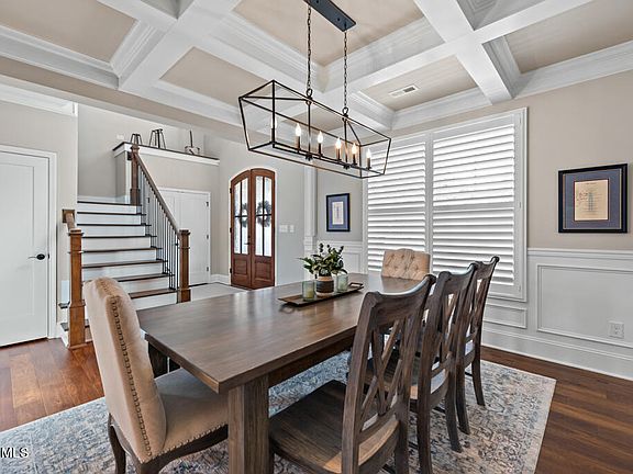 Just off the Kitchen is the formal dining area with coffered ceilings and the living room, featuring built-in shelving/cabinetry and gas fireplace with stacked stone hearth & custom wood mantle.