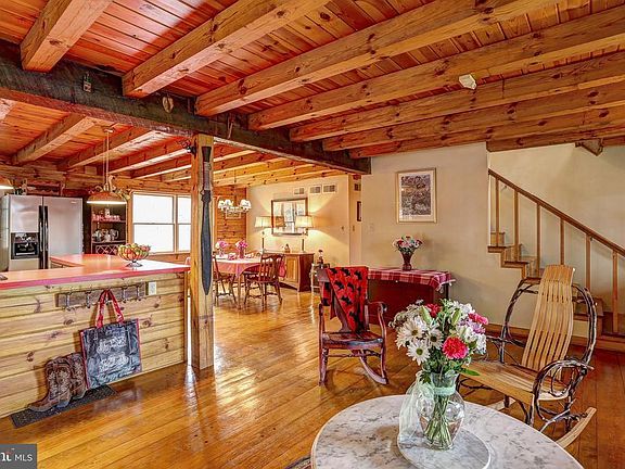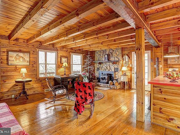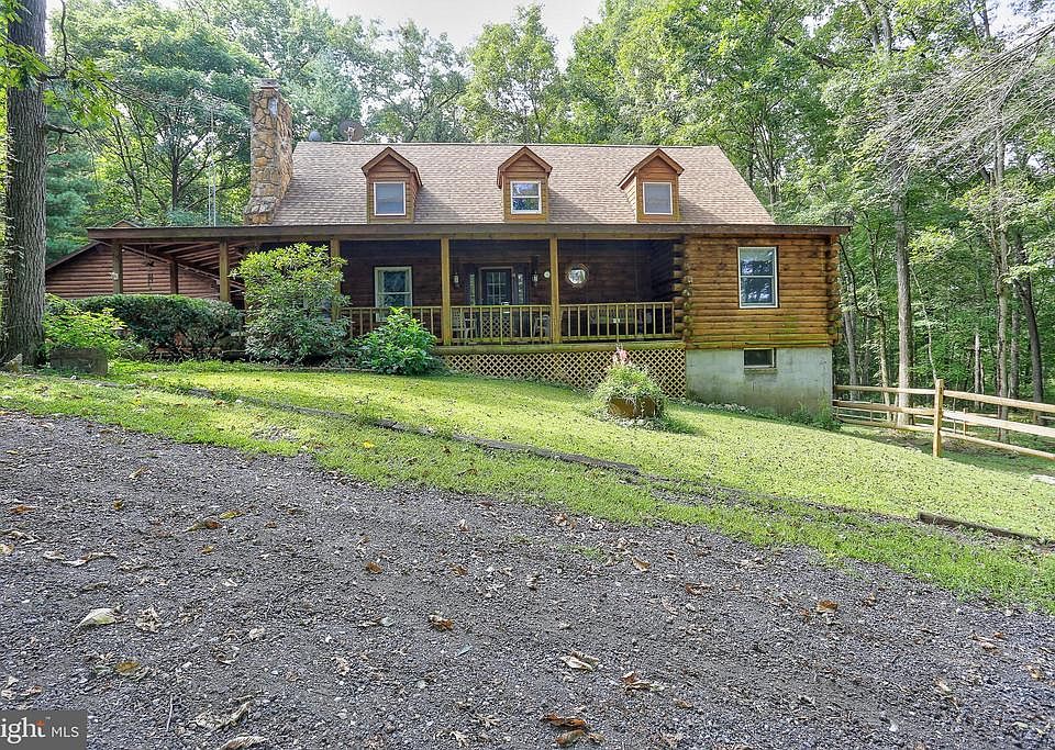 Perfect property layout makes coming home feel like a world away. Custom built charming log cabin. Huge room sizes, beautiful hardwoods, freshly painted and move in read. Two stall barn and outdoor sand stone ring. Two garages, the second built for a lift, plenty of parking. Possible first floor master, office, wood floors. Wood stove in family room. Wrap around porch overlooking property. Quiet country living minutes to modern conveniences. Conveyed as-is.