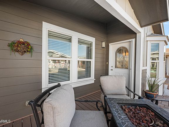 Welcome to this artfully styled fully furnished home. This beauty has vaulted ceilings throughout, neutral two-tone color scheme, beautiful Lazy Boy furniture, 3 flat screen tvs, kitchen island & beautiful cabinets with pull out shelving, separate dining nook, primary bedroom ensuite with walk in closet. Furnishings in 2nd bedroom for both an office/den & bedroom. Ample storage in primary & laundry rooms. GE washer & dryer. The north/south facing outside is made for entertaining! Front patio has fire table & comfy seating for chatting with neighbors on the friendliest street in the community. Landscaped back patio has privacy fence, custom sconces, patio set with fire table & patio heater. Roomy 8x10 shed includes tools & the extended carport leaves room for golf cart parking & more!