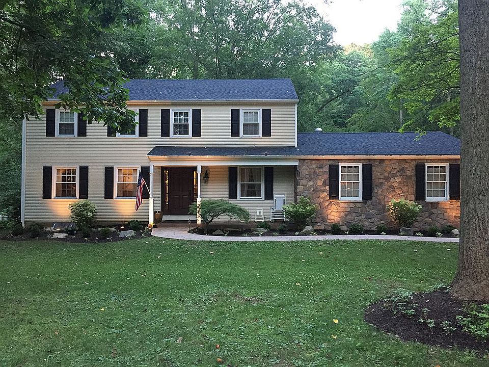 Nestled in the Heart of a 1 Acre Private Wildlife Setting w/its own Meandering Stream is this 4BR, 3.5 Bth Colonial w/Fnshd W-O Bsmt. From the Covered Porch, enter the HW Foyer to a Frml LR & DR w/Moldings, both w/HW Flrs, an Updated KIT w/Eating Area, Granite Cntrs, SS Applns, CT Backsplash & Door to the Deck & FR w/Random Width HW Flrs, Brick FP, Built-ins & Bay Window w/Seat Looking onto the Backyard. Off the KIT is a PR, Lndry Rm w/OE & a Screened Porch w/Ceiling Fan. Upstairs is the Mstr BR
