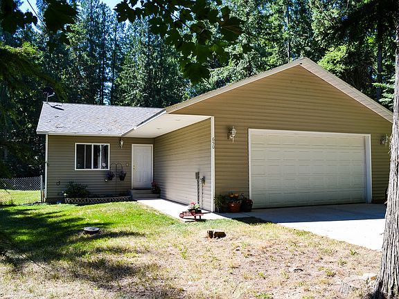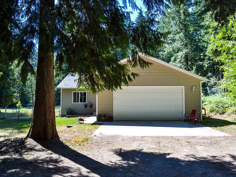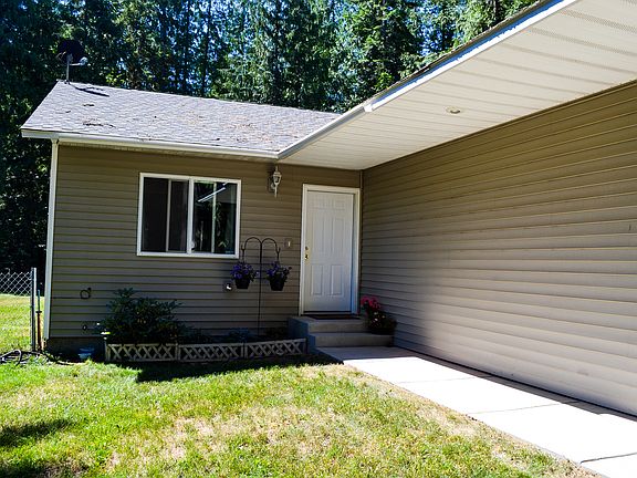 This spacious, 1353 square foot, 2 bedroom, 2 bath home with 2-car garage was built in 2005. The property backs up to Kaniksu National Forest and is just minutes from Lake Pend Oreille and Mirror Lake. Access hiking trails through the forest right from the property. This open concept home has vaulted ceilings in spacious living, dining and kitchen areas. Light and bright with large windows and glass sliding door out to the back patio from dining room. The kitchen has lots of cupboards and counter space, newer refrigerator and range, built-in microwave and garbage disposal. The large master suite has a full bath, huge closet and French doors opening to back patio with a view of the forest and wildlife. There is a designated space for a hot tub with wiring in place, fenced pet area and plenty of room for RV parking. Property is on a maintained road and is connected to the community water system. This home qualifies for all types of financing.